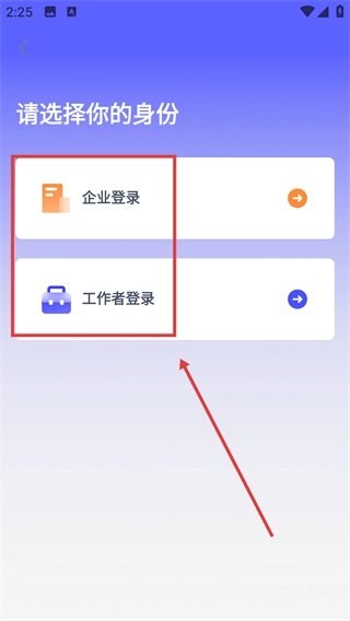 在身份选择页面挑选“企业登录”或“工作者登录”选项,完成登录与身份选择的操作。