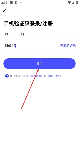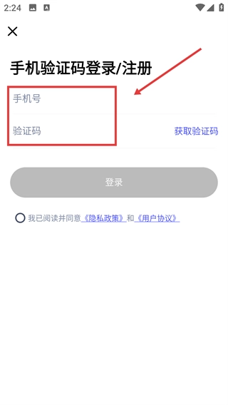 在手机验证码登录或注册界面填写手机号码,获取并填写验证码,同时勾选同意相关协议。