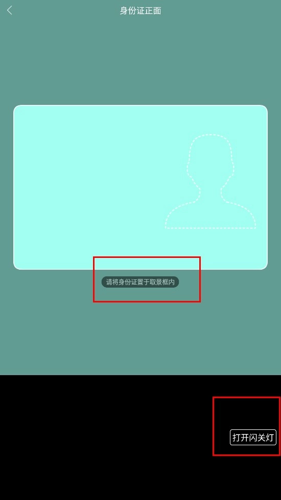 请将身份证放入取景框内,若扫描光线不足,可点击【打开闪光灯按钮】来辅助完成扫描操作。