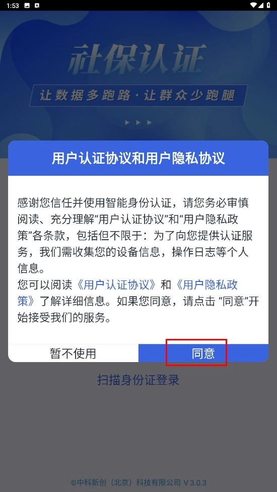 仔细阅读用户认证协议与隐私协议的内容后,点击页面上的【同意】按钮即可。