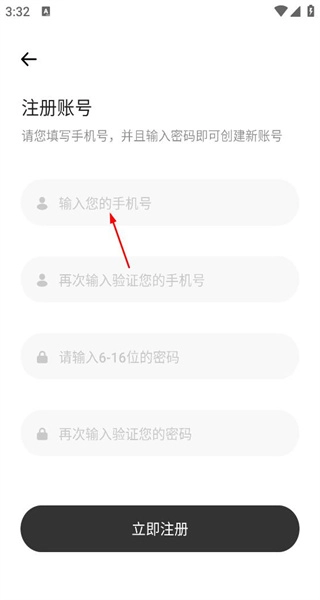 在注册页面,按顺序填写手机号、完成手机号验证、设置密码等信息,即可走完软件的注册流程。