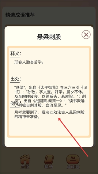 在精选成语推荐页面找到并点击【悬梁刺股】这一选项,即可进入该成语的详情页面。
