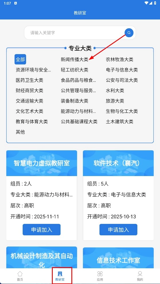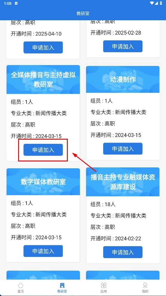 找到对应的目标教研室(例如【全媒体播音与主持教研室】),点击【申请加入】按钮,即可完成教研室的加入流程。