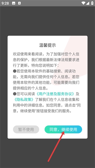 在【来看阅读-】弹出的温馨提示窗口里,点击【同意,继续使用】按钮,这样就能接受《用户注册及服务协议》与《隐私政策》并进入应用了。
