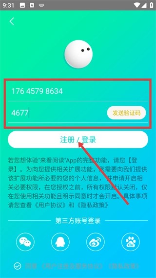 在登录界面,输入手机号与验证码,随后点击【注册/登录】按钮,即可完成账号登录流程。
