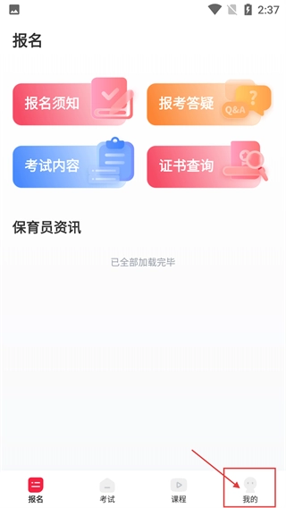在报名页面,你可以查看【报名须知】、【考试内容】等相关模块,点击页面底部的【我的】选项,就能进入个人中心,进而获取题库之类的服务。