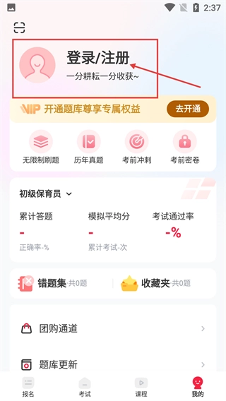 进入个人中心后,点击顶部的【登录/注册】区域,就能完成账号登录;登录成功后,即可使用无限制刷题、历年真题等VIP题库功能。