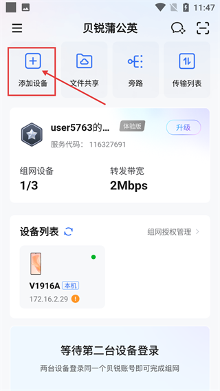 在贝锐蒲公英的主界面上,找到并点击【添加设备】按钮,即可启动设备添加流程,此功能的作用是增加组网设备的数量。