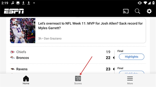 点击底部的【Scores】按钮,就能查看NFL等赛事的最终比分。