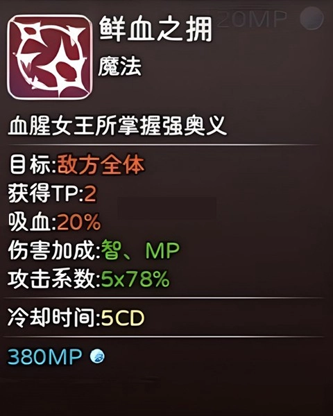 血腥女王的“鲜血之拥”是我个人很喜欢的AOE技能,它的伤害比风雷更高,美中不足的是没有附带负面效果,而且释放这个技能还能让角色瞬间回满生命值与法力值。