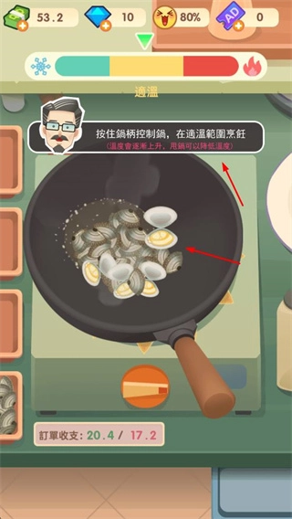 握住锅柄来操控锅具,在合适的温度区间内烹制蛤蜊,保证菜品能够熟透入味,从而提高顾客的满意程度。