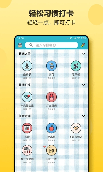 今天需要坚持的习惯会在TODAY页面单独展示,只需轻点对应的图片,就能完成该习惯的打卡操作。