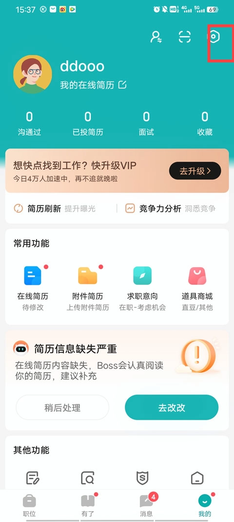 1、打开手机中的boss直聘软件,进入我的界面,选择右上角的设置按钮