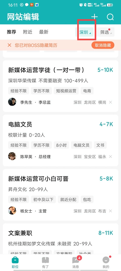 1、打开手机boss直聘软件,在首页找到城市的位置并点击(如下图)