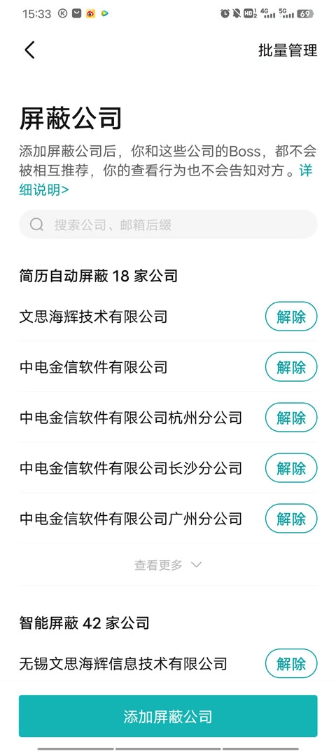 4、输入你想要屏蔽的公司名,点击添加屏蔽公司即可完成屏蔽