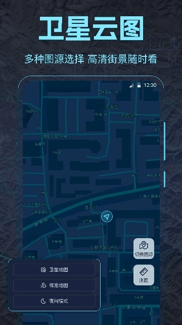 4、通过卫星云图,你可以以鸟瞰的视角查看地球各个街道的全貌。并支持三种地图模式的相互切换。