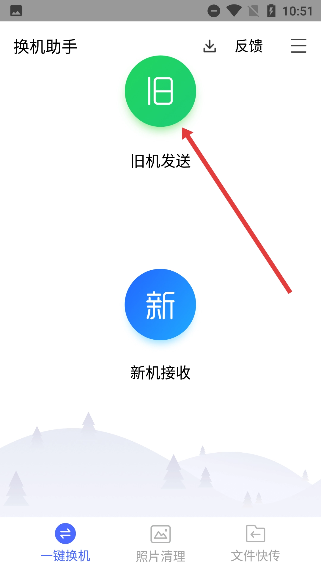在【换机助手】界面中点击【旧机发送】按钮,即可进入资料选择页面。