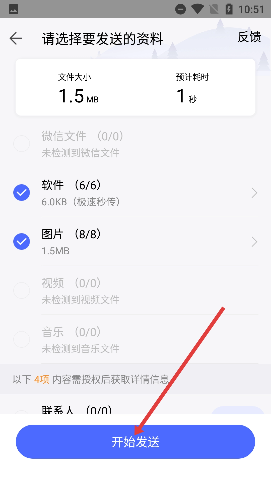 在资料选择页面勾选需要发送的资料后,点击【开始发送】按钮。