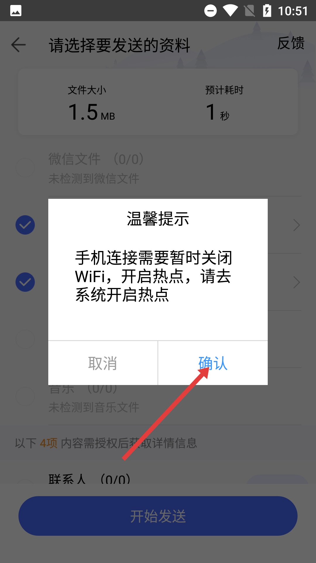 当弹出【温馨提示】的弹窗时,点击其中的【确认】按钮,随后按照提示开启热点,以此来建立连接。