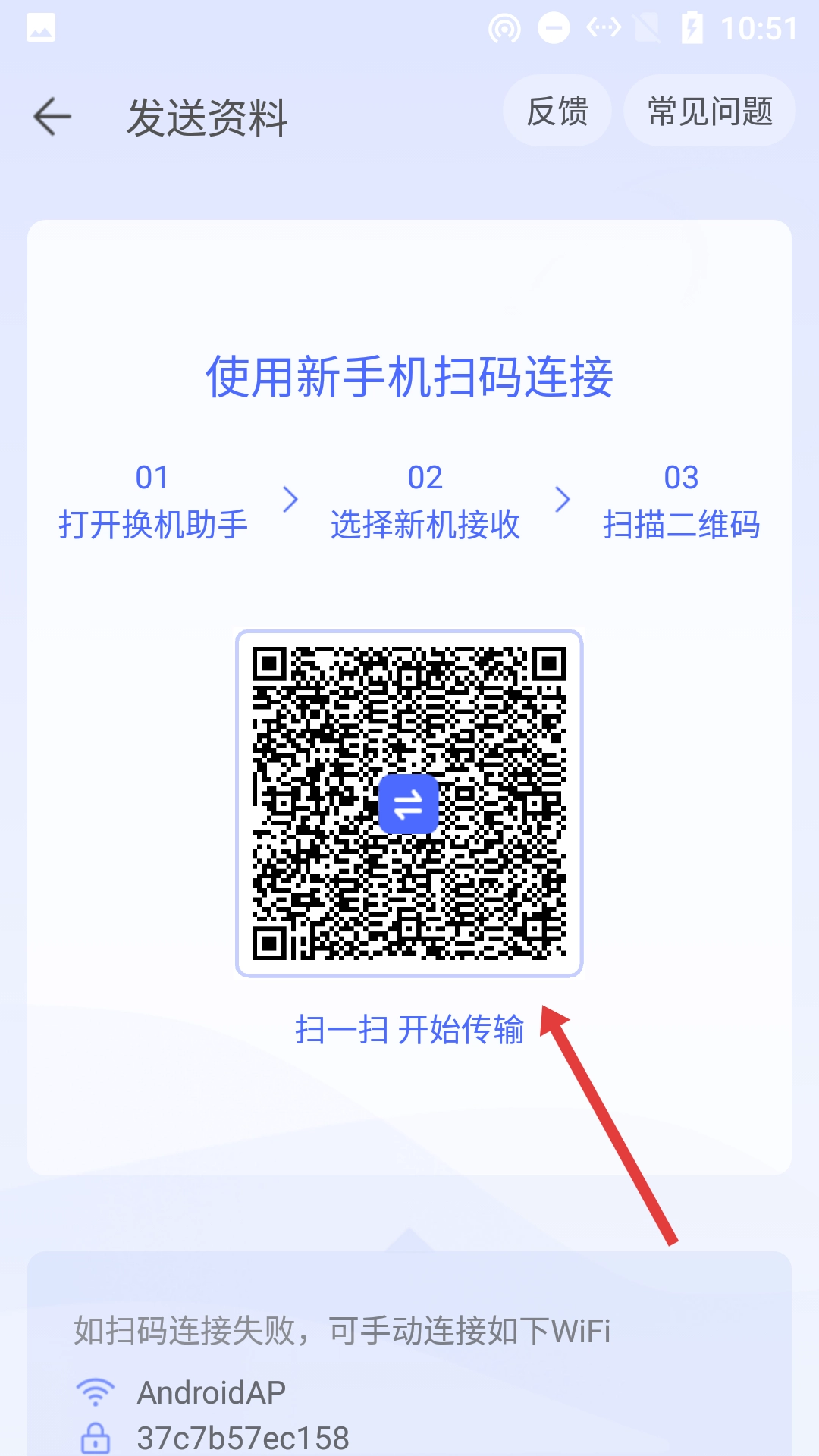 用新手机扫描发送页面上的二维码,就能启动资料传输了。