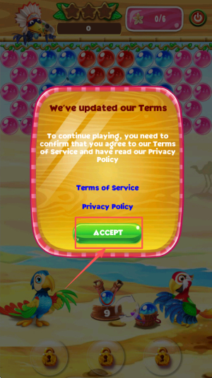 在条款更新页面仔细阅读相关说明后,点击「ACCEPT」按钮以确认同意服务条款与隐私政策,随后即可继续进行游戏。