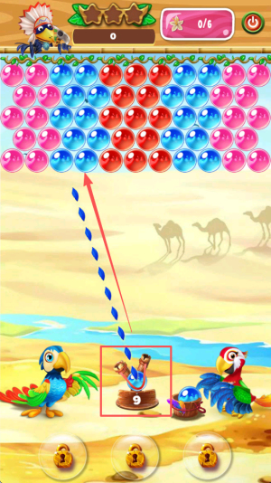瞄准射击消除:专注瞄准气球发射泡泡,通过匹配相同颜色的泡泡达成消除,击破困住幼鹦鹉的气球,完成解救任务。