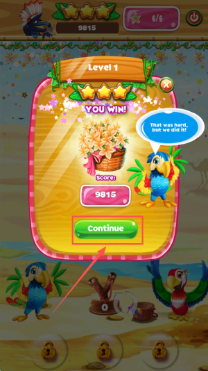 当进度条显示「6/6」且屏幕上出现「YOU WIN!」时,点击「Continue」按钮即可领取9815积分并进入下一关。
