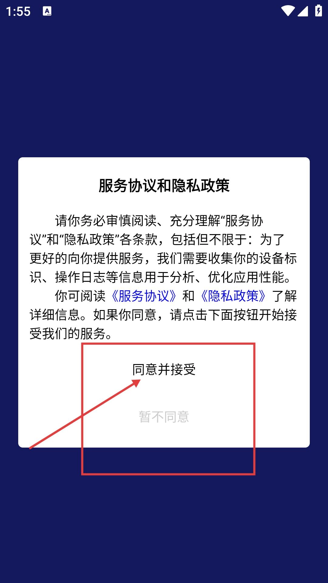程序启动后,会弹出服务协议与隐私政策的说明页面,点击【同意并接受】按钮,即可进入主界面开启功能使用。
