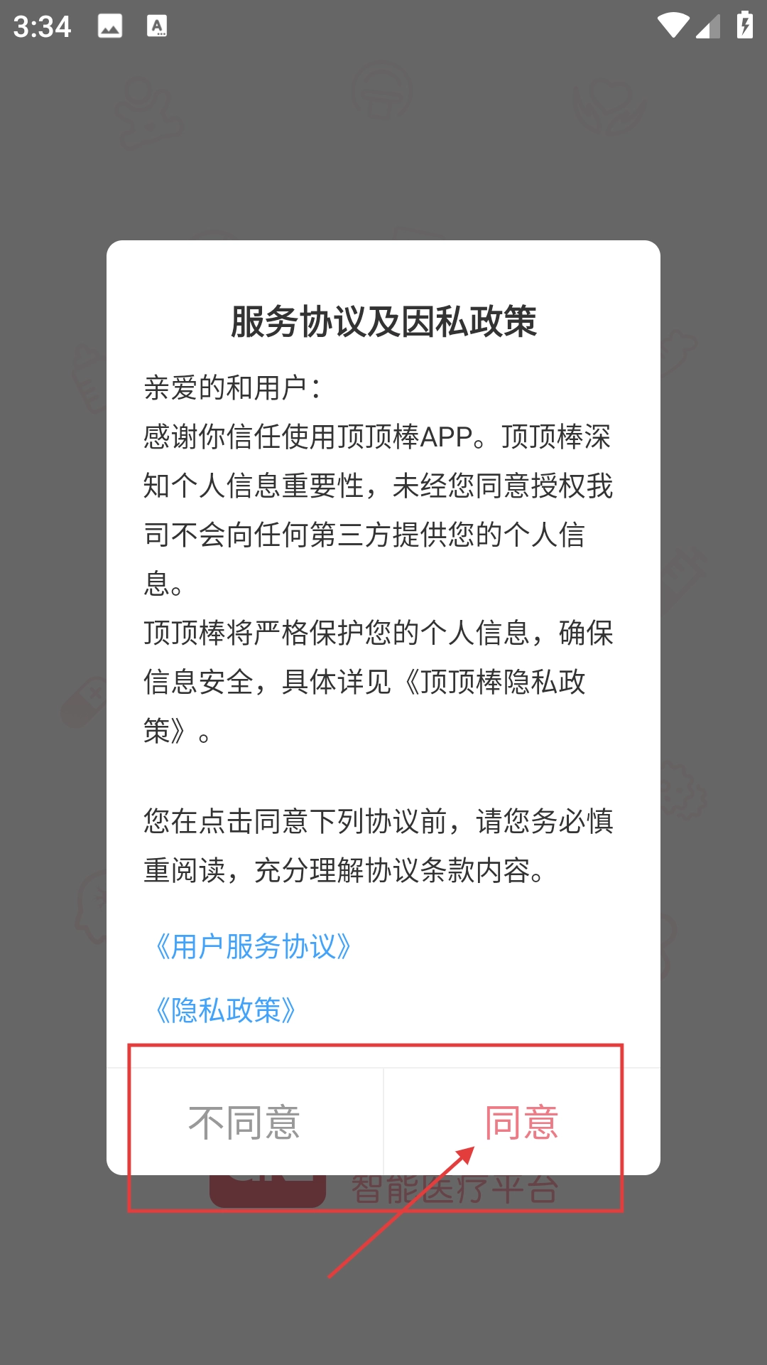 启动过程中会出现服务协议与隐私政策的说明页面,点击【同意】按钮后,就能进入到下一个界面。