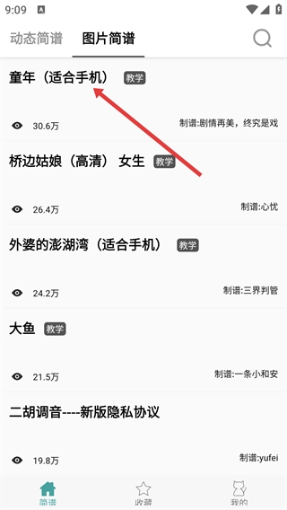 进入【图片简谱】页面后,你可以浏览像【童年(适合手机)】这类简谱列表,点击感兴趣的简谱标题就能进入详情页。
