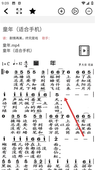在简谱详情页,能够查看【童年(适合手机)】的简谱内容,并且可以借助页面上的功能按钮,进行放大、收藏、播放等操作,以此辅助简谱的查看与使用。