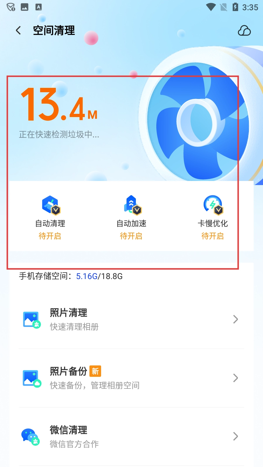 进入空间清理页面后,等待垃圾检测完成。