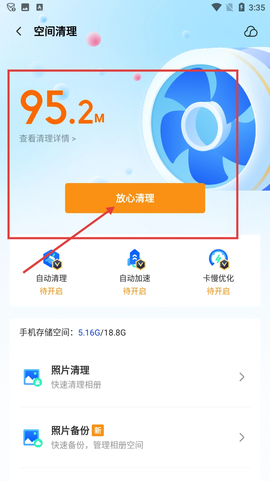 检测完成后,点击【放心清理】按钮开始清理垃圾。