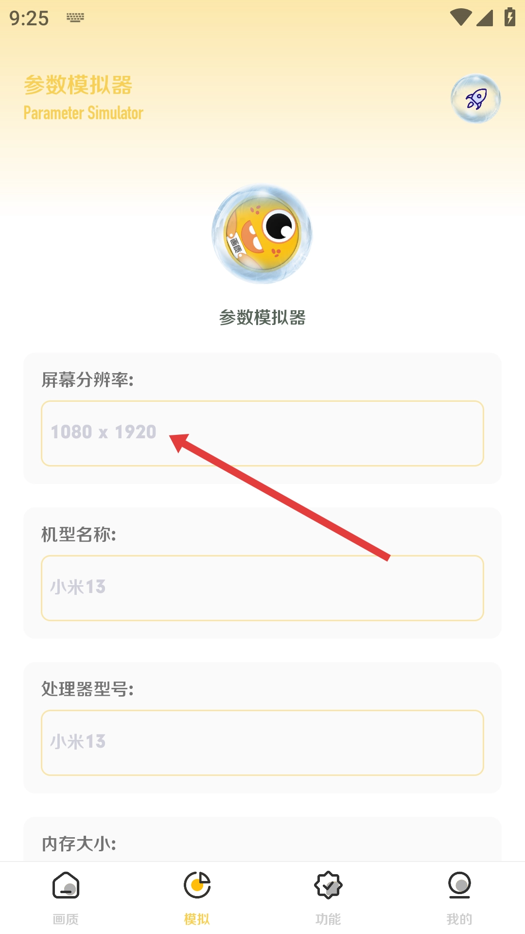 在【参数模拟器】界面,能够查看和编辑【屏幕分辨率】之类的设备参数,从而适配游戏画质。
