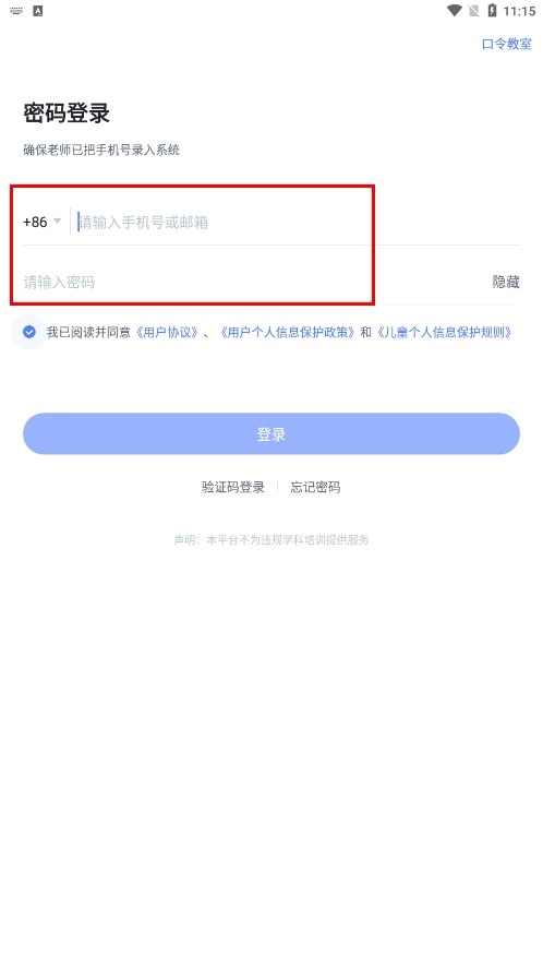 在密码登录界面,填写手机号或邮箱以及密码,勾选相关协议后点击登录按钮。