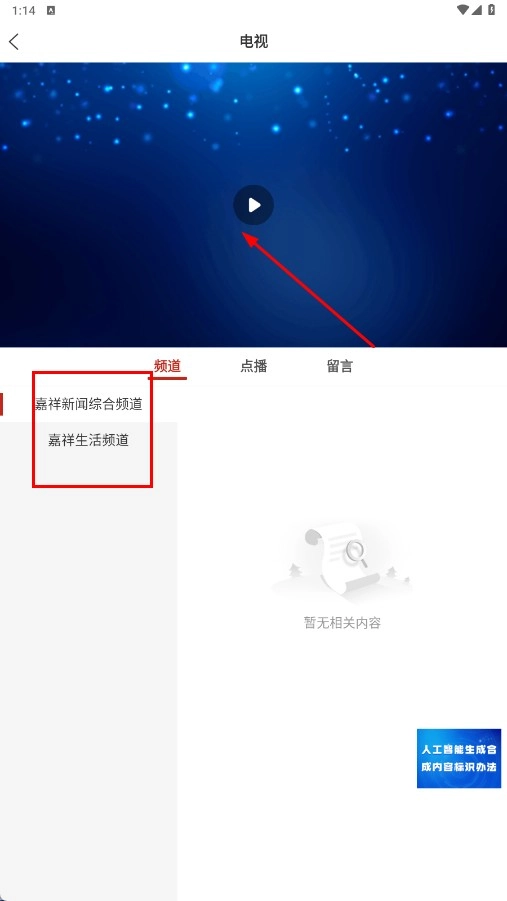 在电视界面中,您可以选择【嘉祥新闻综合频道】和【嘉祥生活频道】等频道,点击播放按钮即可观看节目。