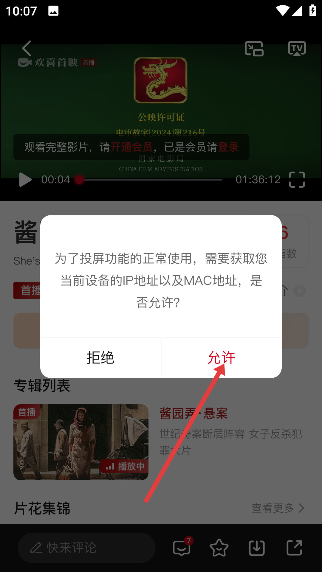 当投屏权限请求弹窗出现时,点击【允许】按钮,就能授予设备获取IP地址与MAC地址的权限,以此保障投屏功能可以正常运行。