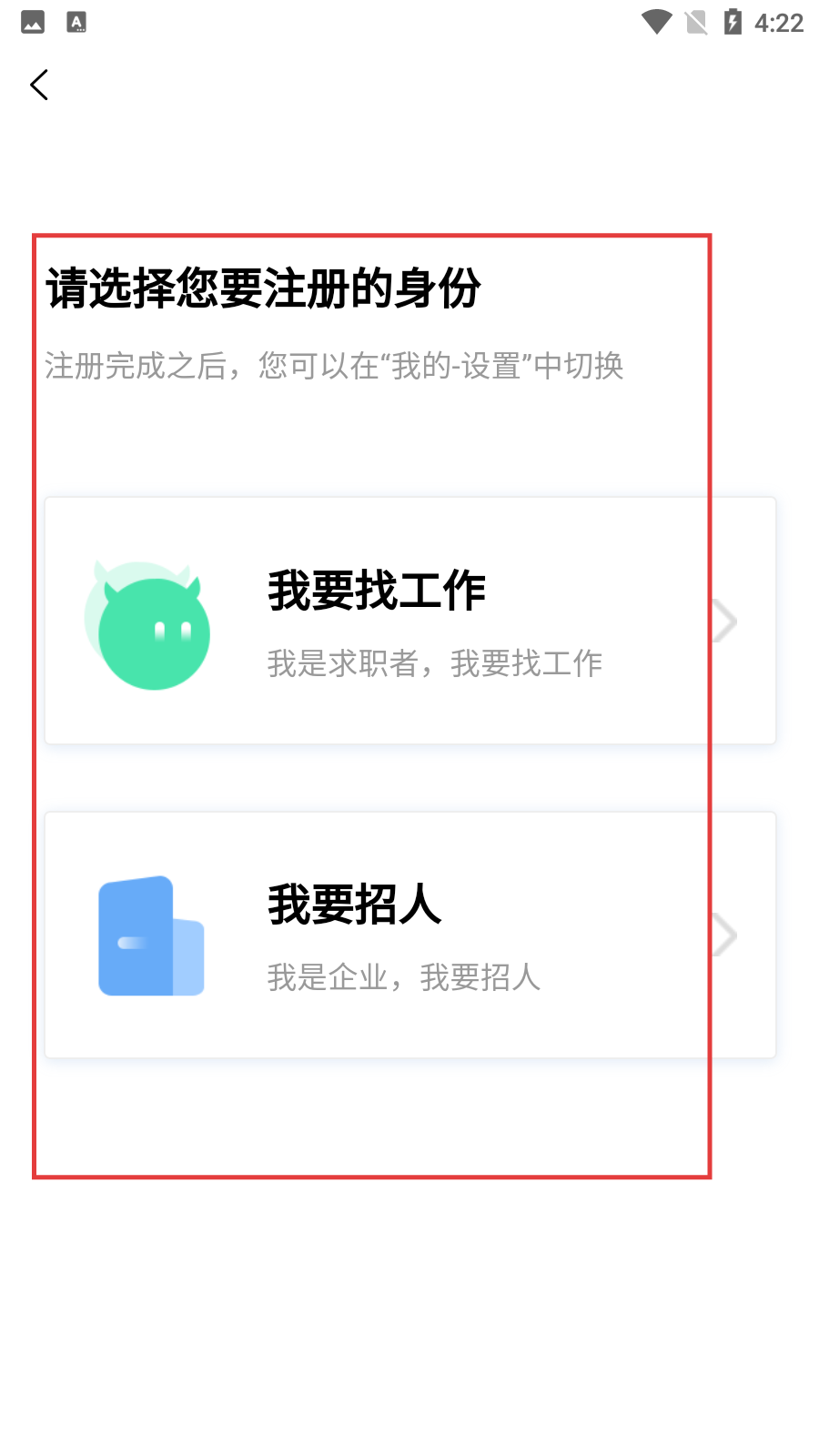 选择注册身份时,您可以在【我要找工作】(求职者)和【我要招人】(企业)两个选项中进行选择,之后依照提示完成注册流程即可。