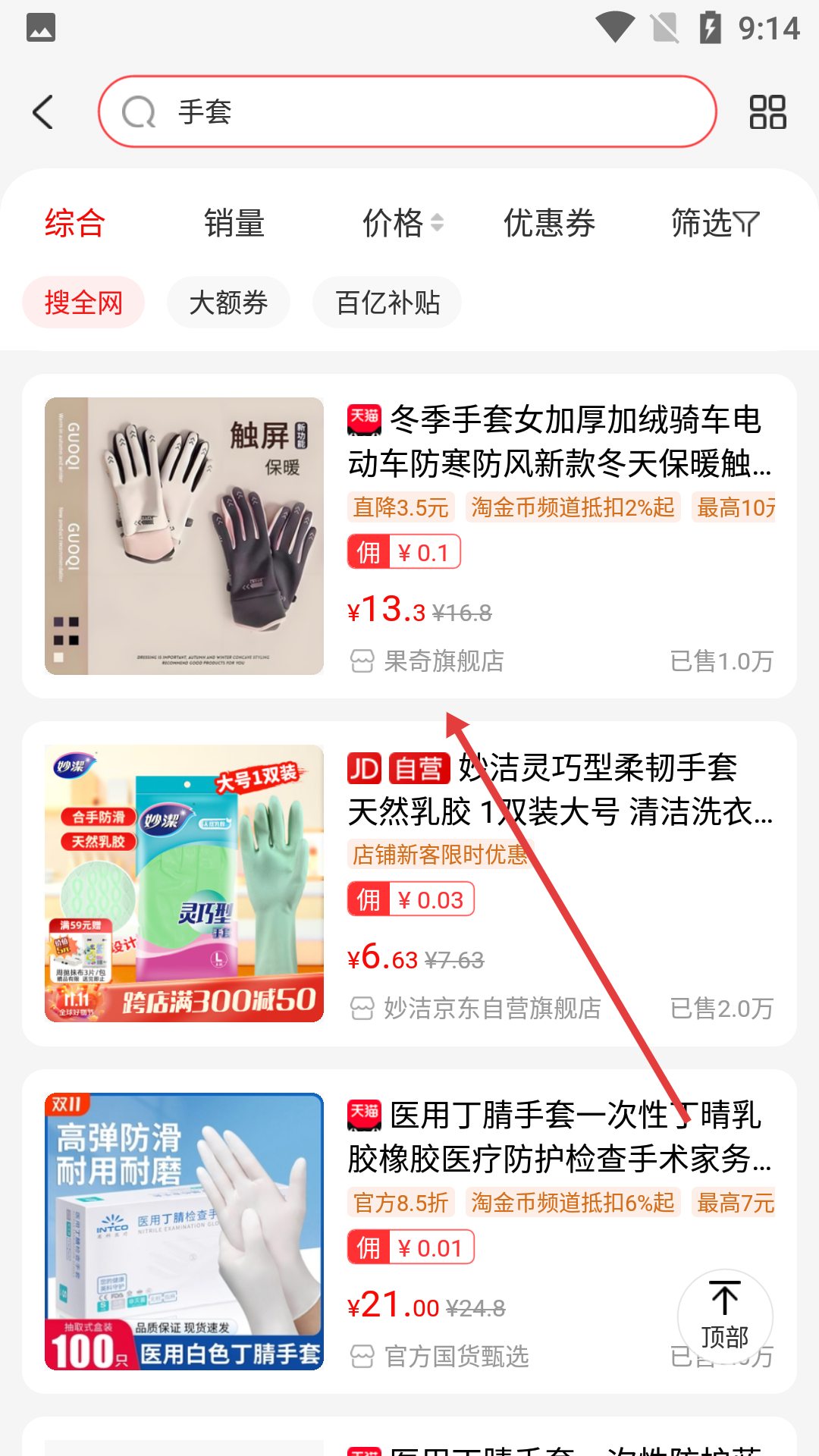 在搜索框里输入【手套】,接着点击搜索按钮,然后浏览搜索出来的商品列表。