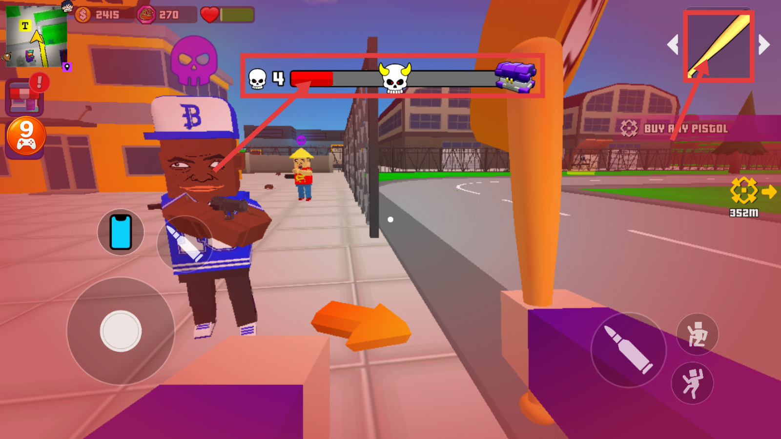 战斗过程中留意血量条状态,通过点击攻击按钮展开攻势,维持自身战斗力,以推进【BUYANYPISTOL】的任务进程。