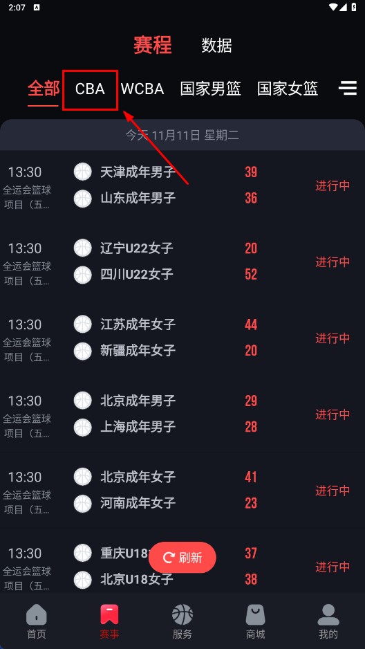 在赛事页面,点击【CBA分类标签】,即可查看CBA赛事的赛程安排。