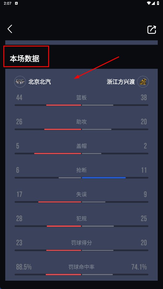 在赛事详情页面,你可以查看【本场数据】板块,从而了解比赛双方在篮板、助攻、盖帽等方面的数据对比情况。