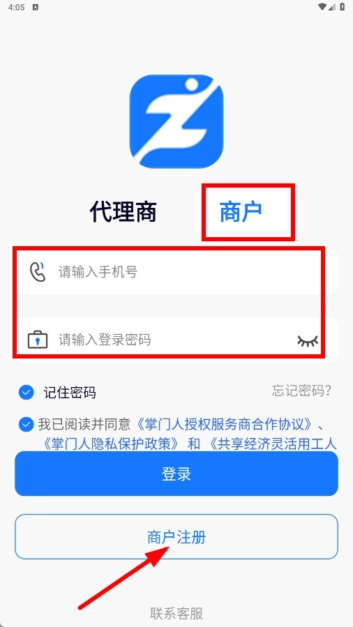 切换至【商户-身份标签】登录页面,输入手机号码与登录密码,勾选相关协议后,点击【登录-功能按钮】完成登录操作。