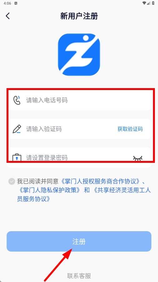 进入代理商注册页面,依次输入手机号码、验证码并设置密码,勾选相关协议后,点击【注册】功能按钮即可完成注册流程。