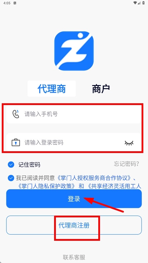 在代理商登录页面,输入手机号码与登录密码,勾选相关协议后,点击【登录】功能按钮完成登录操作。