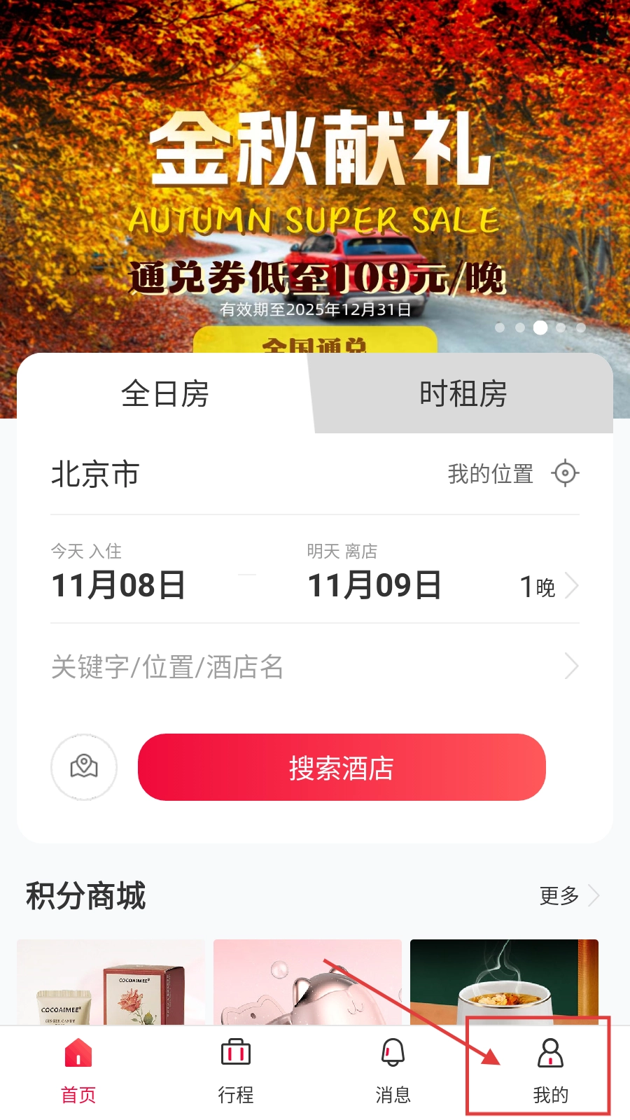 进入首页后,能看到酒店搜索功能与积分商城等板块,点击右下角的【我的】即可进入个人页面。