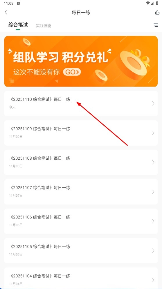 在每日一练页面,挑选当天的练习项目,比如【《20251110综合笔试》每日一练-练习名称】。
