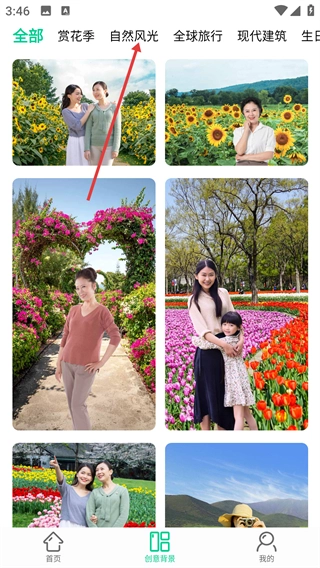 在创意背景页面找到并点击【自然风光】分类,即可进入该分类对应的背景列表页面。