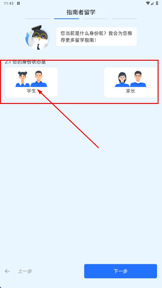 请从身份选项中选择【学生】,点击“下一步”即可进入后续操作流程。