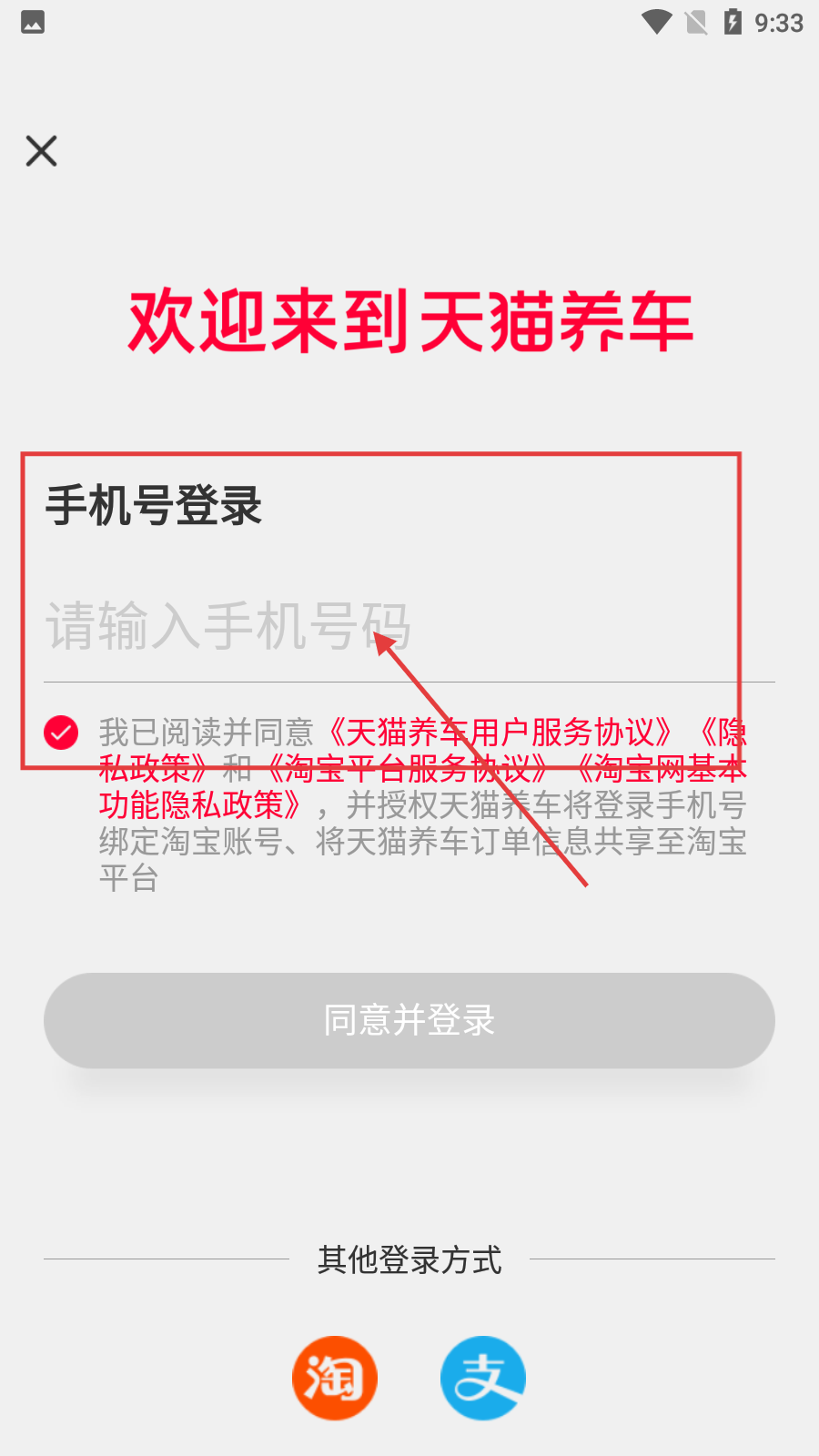 进入登录页面后,选择用手机号登录的方式,在“请输入手机号码”的输入框里填写你的手机号,然后点击“同意并登录”按钮。
